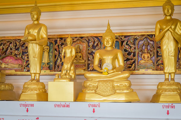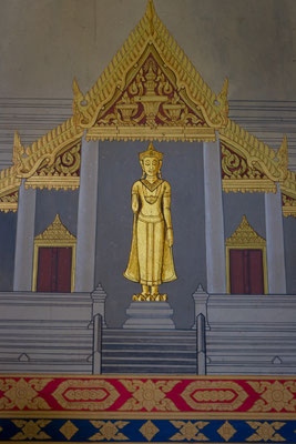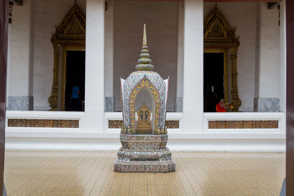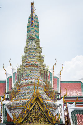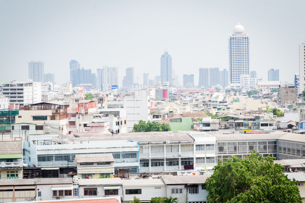 Wir haben uns unglaublich auf diesen königlichen Tempel gefreut. Wurden jedoch davor abgefangen und uns wurde mitgeteilt, dass leider eine Zeremonie zu dem Zeitpunkt stattfinden würde und man daher heute nicht rein könne (mittlerweile sind wir uns nicht so sicher, ob das gestimmt hat ;-)) So teilte er uns andere tolle Sehenswürdigkeiten mit und suchte uns eine Busverbindung, bis plötzlich ein Tuk Tuk vorbeifuhr und er uns fragte, ob wir denn schon mal mit einem gefahren wären…naja lange Rede kurzer Sinn er organisierte uns ein Tuk Tuk für 50 Baht (~1,50 €) und dieses würde uns auch für den Preis den Rest des Tages zur Verfügung stehen. Erst fanden wir es merkwürdig und dachten schon es wäre etwas faul daran, aber er fuhr uns brav zum nächsten Ort den wir besichtigen wollten, dem Golden Mount (80 m hoher künstlicher Hügel am Wat Saket). Von hier aus hat man eine wundervolle Aussicht. Die vielen Treppen (318) stellen zwar bei den Temperaturen eine Herausforderung dar, aber wenn man schon mal da ist, mag man Bangkok natürlich auch einmal so sehen. Zudem ist das Kloster am Fuß des Berges eines der ältesten der Stadt und damit auf alle Fälle ein Besuch wert.