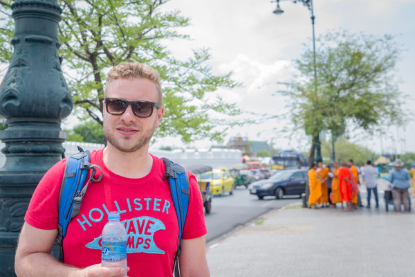 Das Gefühl zwischen den ganzen Thais und Asiaten in der Metropole ist ein unglaublich „cooles Gefühl“. Mitten im Getümmel fühlt man sich irgendwie trotzdem keine Sekunde so richtig verloren, ganz komisch zu beschreiben ;-) Es gibt auch viele hilfsbereite Thais dort. Aber ACHTUNG nicht jedem in dieser Stadt trauen. Hier wird oftmals versucht den Touristen das Geld aus der Tasche zu locken, wir haben selbst eine der berüchtigten Fallen mitgenommen. Es heißt, man sollte nie mit einem Tuk Tuk-Fahrer fahren, der schon aufdringlich auf dich zu kommt. Darauf haben wir auch brav geachtet, wir haben uns den gelangweiltesten Fahrer gesucht. Er schien sich nicht mal besonders zu freuen, als wir ihn angesprochen haben. Mit ihm war alles recht problemlos, außer dass wir natürlich mit 150 Baht (knapp unter 5 €) viel zu viel für eine solche Fahrt (für die dortigen Verhältnisse) gezahlt hatten, aber das war uns in dem Moment egal, da wir dort unbedingt mal Tuk Tuk fahren wollten. Er hat uns an unserem ersten geplanten Punkt für unsere Sightseeing-Reise durch Bangkok rausgelassen, vor dem weltbekannten Wat Po.